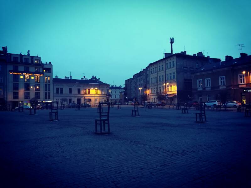 La piazza, situata nel quartiere di Podgórze, commemora le vittime ebraiche della guerra sia attraverso il suo nome che con un'installazione artistica di sedie che si trova lì