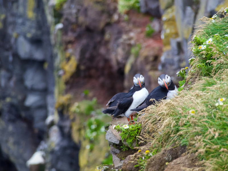 Questi simpatici uccelli sono una vista comune in Islanda e aggiungono un ulteriore tocco di magia al paesaggio di Reynisfjara, rendendola un must per gli amanti della natura e della fotografia.