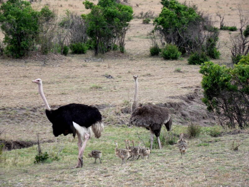 Una famiglia di struzzi: mamma, papà ed i piccoli! Il maschio dello struzzo è quello, tra i due, più bello, con il piumaggio nero e bianco.