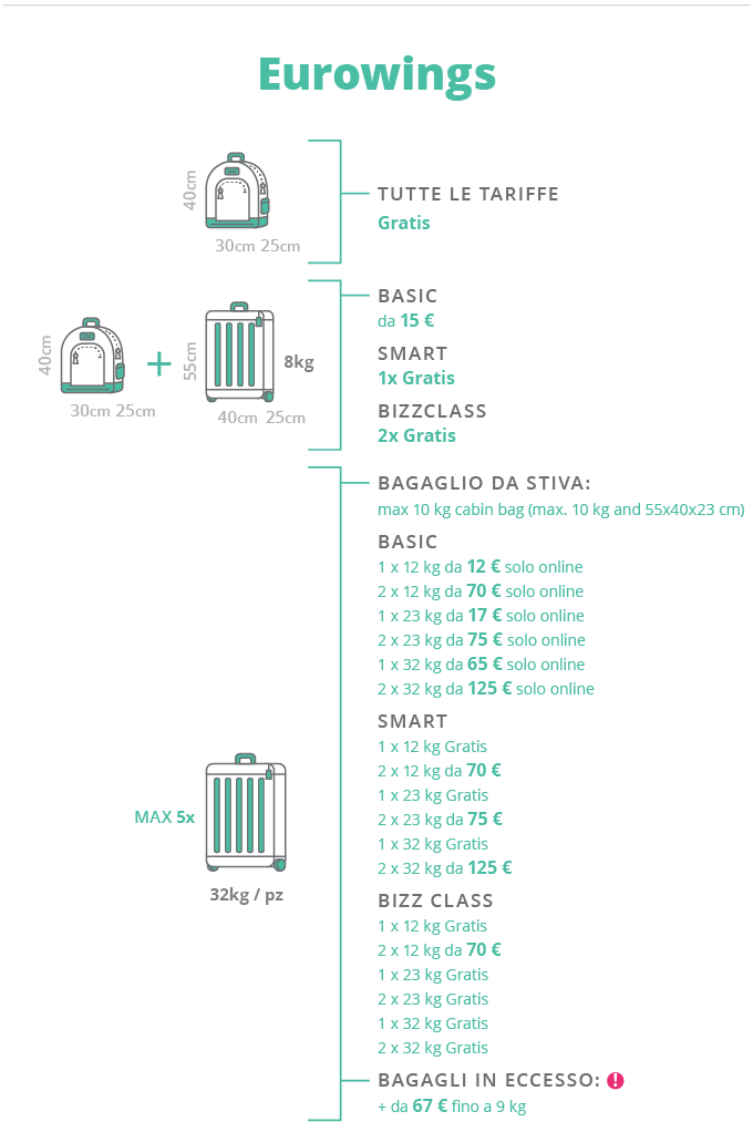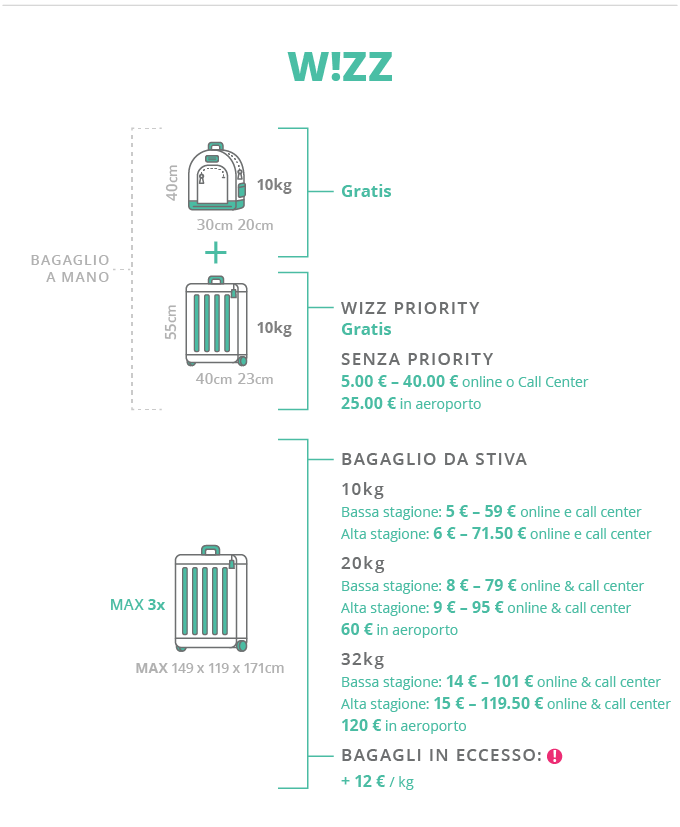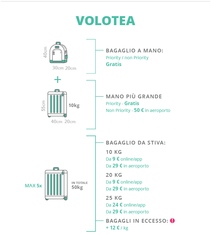E' utile sapere che le compagnie aeree low-cost permettono di portare, gratuitamente, un bagaglio a mano di dimensioni ridotte, 40x25x20, che in aereo non andrà posizionato sulla cappelliera ma sotto in sedile antistante.