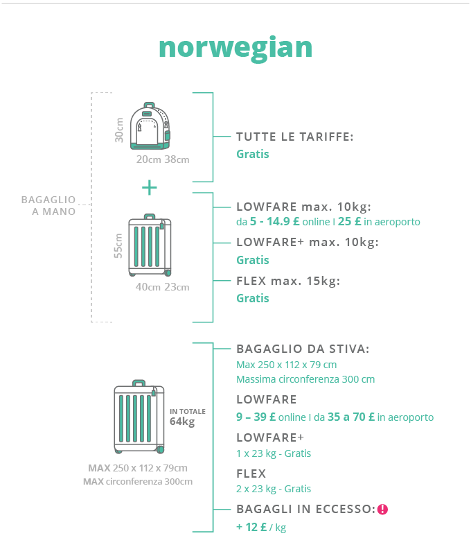 La maggior parte delle compagnie aeree ha limiti in dimensioni e peso simili, ovvero è consentito un solo bagaglio a mano delle dimensioni di circa 55x40x20cm e peso non superiore ai 10kg.