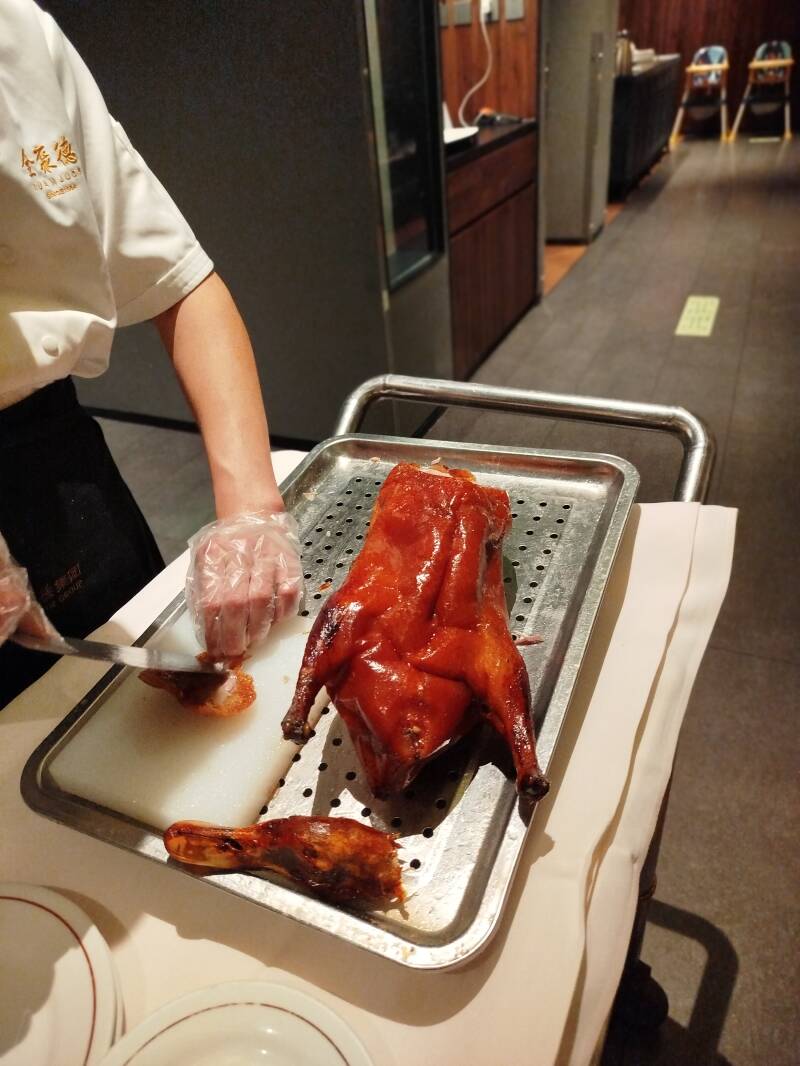 Lo chef si è presentato al nostro tavolo con un carrellino su cui era posizionata l'anatra intera, con tanto di collo e testa, fragrante di forno e pronta per essere affettata.