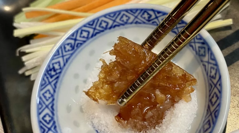 Scopriamo presto a cosa servono la pasta d'aglio e lo zucchero: lo chef ci serve la pelle croccante in un piattino; ogni pezzetto deve essere aromatizzato con lo zucchero o con la pasta d'aglio, per esaltarne il sapore e per sperimentare il delizioso contrasto tra grassezza e dolcezza.
