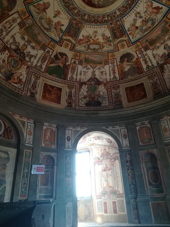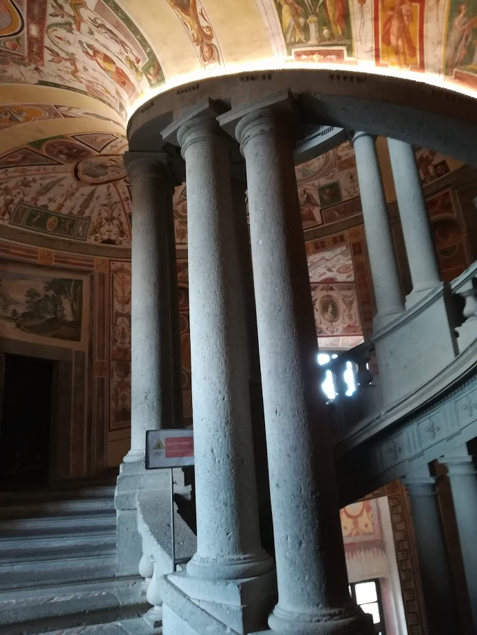 È l'ingresso nel mondo dei Farnese: una spettacolare scala elicoidale affrescata; una salita dolce, quasi teatrale, sotto volte affrescate e colonne che sembrano danzare attorno a voi.