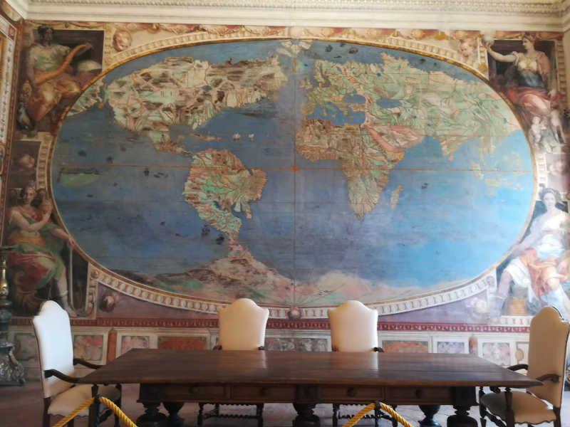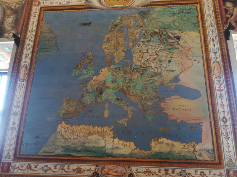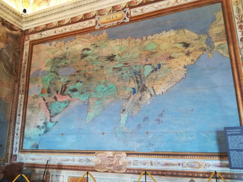 Una delle più iconiche: qui enormi mappe affrescate raccontano il mondo conosciuto nel Cinquecento.