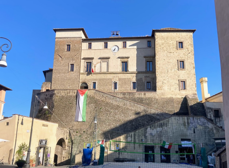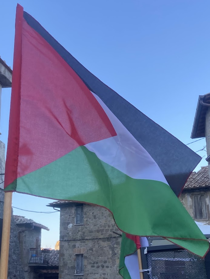 Durante l’iniziativa, una bandiera palestinese ha sventolato sulla Rocca Colonna, simbolo semplice ma potente del legame che unisce il borgo alla Palestina.